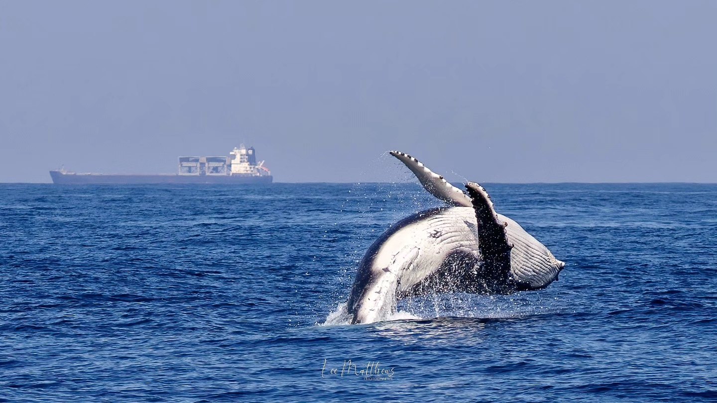 Adding to the scene, the backdrop of a large container ship on the horizon gave a striking sense of scale and perspective, highlighting just how immense yet graceful these whales truly are.