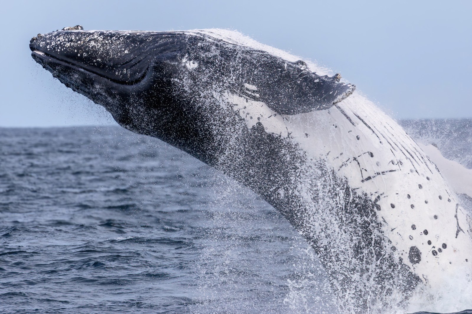 The afternoon brought even more spectacular moments. We spent much of the time in the company of a very active mother and calf. The calf was particularly energetic, practicing its breaching skills with gusto. At one point, they decided to come in nice and close to our boat. We were “mugged” in the best way possible, as they swam under and around our boat, with the calf continuing to breach right next to us!